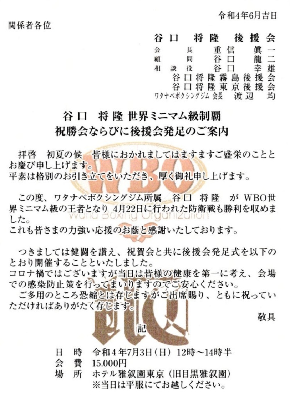 ■谷口将隆WBO世界ミニマム級制覇 祝勝会並びに後援会発足のご案内!(2022.7.3)