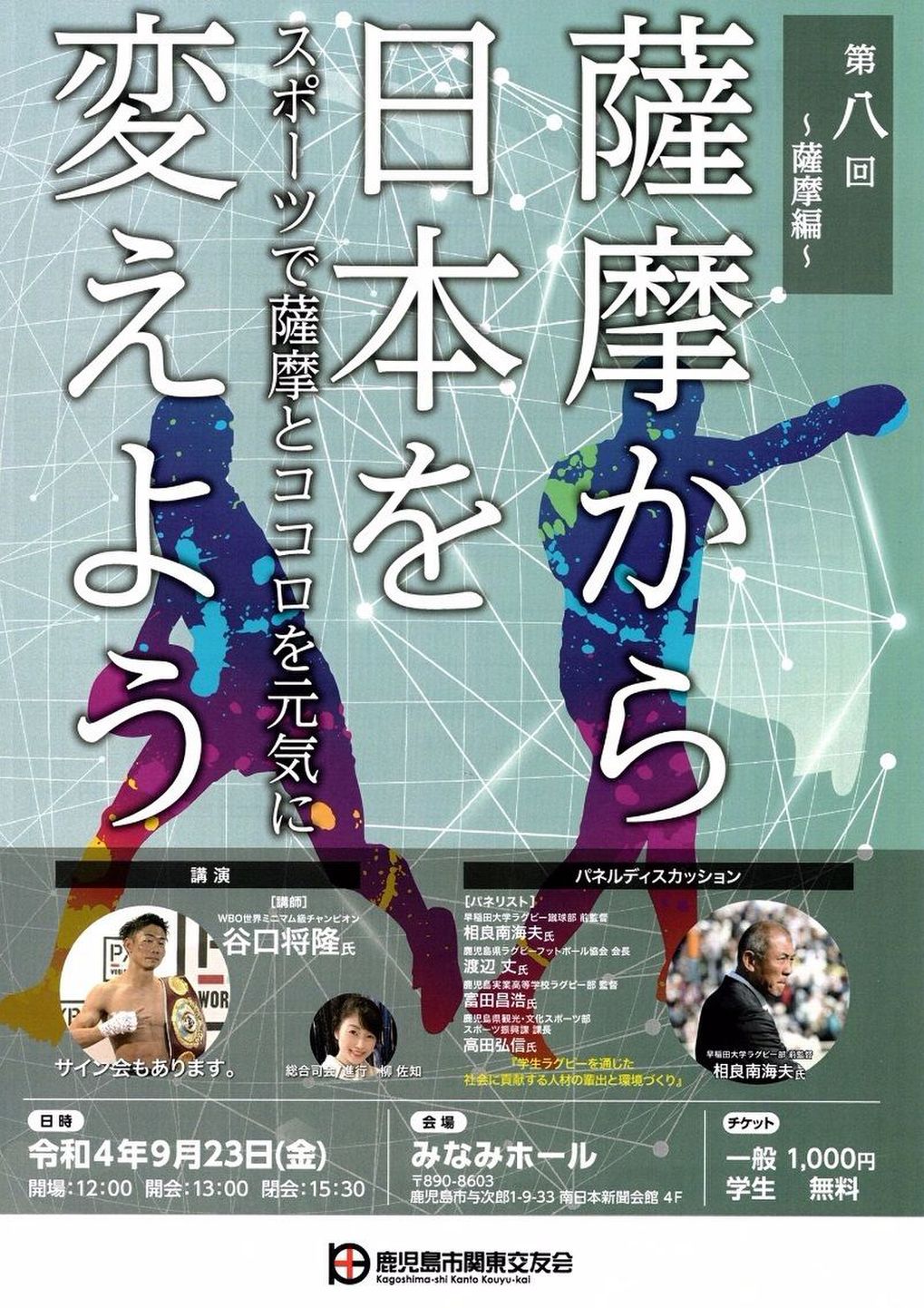鹿児島市関東交友会では「薩摩から日本人の誇りを取り戻そう」というスローガンを掲げ第7回(令和元年9月21日)まで講演活動してきました。しかしながらコロナ禍で開催出来ずにいましたがやっと3年ぶりに第8回を開催することになりました。今回のシンポジウムはコロナ疲れとも言える状況や猫の目のように転換する国際情勢に気を揉んできた心と、遠く故郷を離れた人々にとっていつまでもそうあって欲しい地方に元気を取り戻したいと願いを込め、『スポーツで薩摩とココロを元気に』と銘打ち講演を企画いたしました。