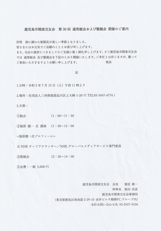 ■鹿児島市関東交友会第30回通常総会&懇親会7/15開催のお知らせ!(2023.6.25)