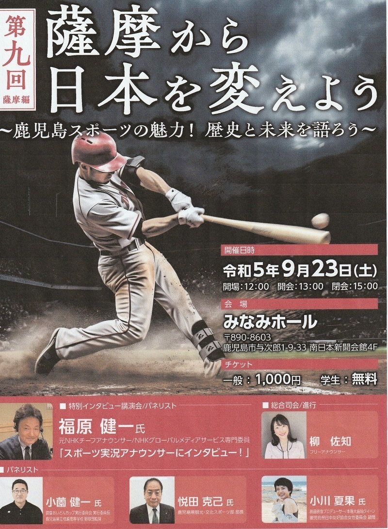 今回の第9回「薩摩から日本を変えよう~鹿児島スポーツの魅力!歴史と未来を語ろう~」は昨年のメインテーマスポーツの「ラグビー」から「野球」の講演・シンポジウムで「薩摩とココロを元気にしたい」と下記並びにチラシの通り開催いたします。