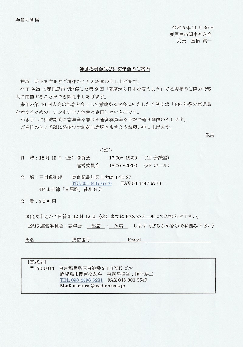 ■鹿児島市関東交友会運営委員会&忘年会12/15開催のお知らせ!(2023.11.30)