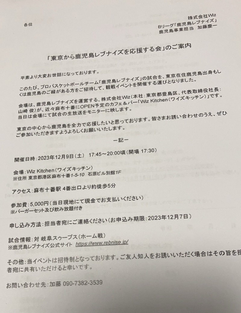 ■『東京から鹿児島レブナイズを応援する会』12/9開催のお知らせ!(2023.11.24)