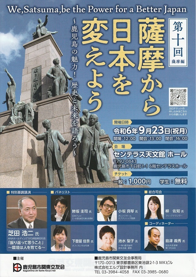 今回の第10回「薩摩から日本を変えよう~鹿児島の魅力!歴史と未来を語ろう~」は特別基調講演に講師としてANAホールディングス芝田浩二代表取締役社長が「振り返って思うこと」~環境は人を育てる~を講演します。またパネルディスカッションは当会の特別顧問で加治木島津家第13代当主の島津義秀氏が鹿児島に伝わる歴史的教え「島津日新公いろは歌」を基に4名のパネラーと鹿児島の未来を大いに語っていただきます。