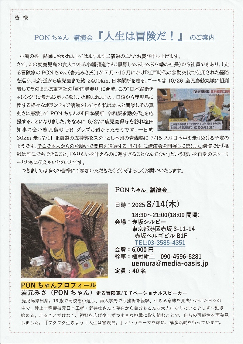 PONちゃん講演会『人生は冒険だ!』のお知らせ!(2025.8.14)