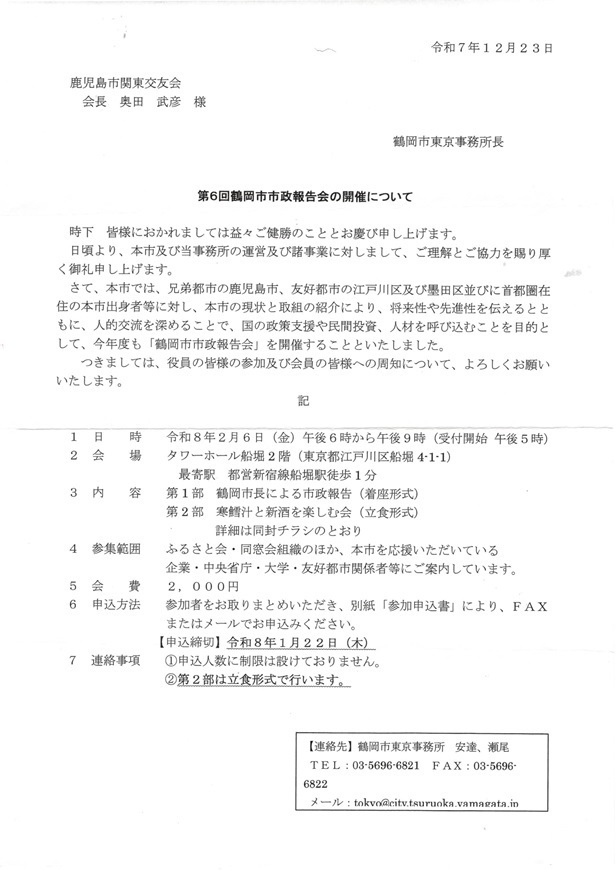 ■第6回鶴岡市市制報告会「寒鱈汁と新酒を楽しむ会」参加報告(植村)2026/2/6(金)